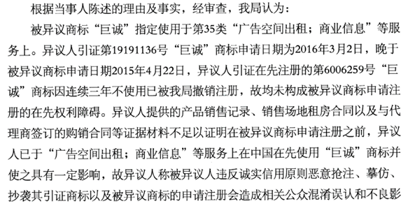 被異議商標(biāo):第35類16772388號(hào)“巨誠(chéng)”