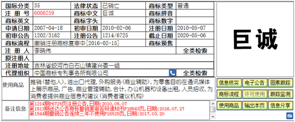 被我所撤銷的“巨誠(chéng)”商標(biāo)(亦是引證商標(biāo)):