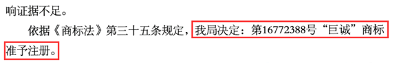 2)“巨誠(chéng)”商標(biāo)準(zhǔn)予注冊(cè)決定書(shū)