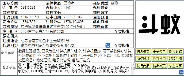 江蘇首屏信息產(chǎn)業(yè)有限公司于2016年10月20日提交了第9類、第38類及第42類“斗蟻”商標(biāo)的注冊(cè)申請(qǐng),并于2017年9月6日通過(guò)初審進(jìn)入公告期。