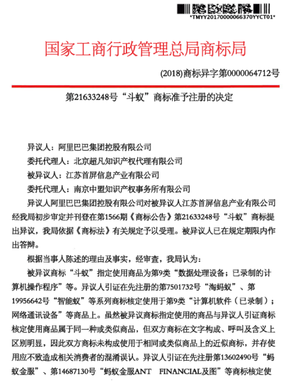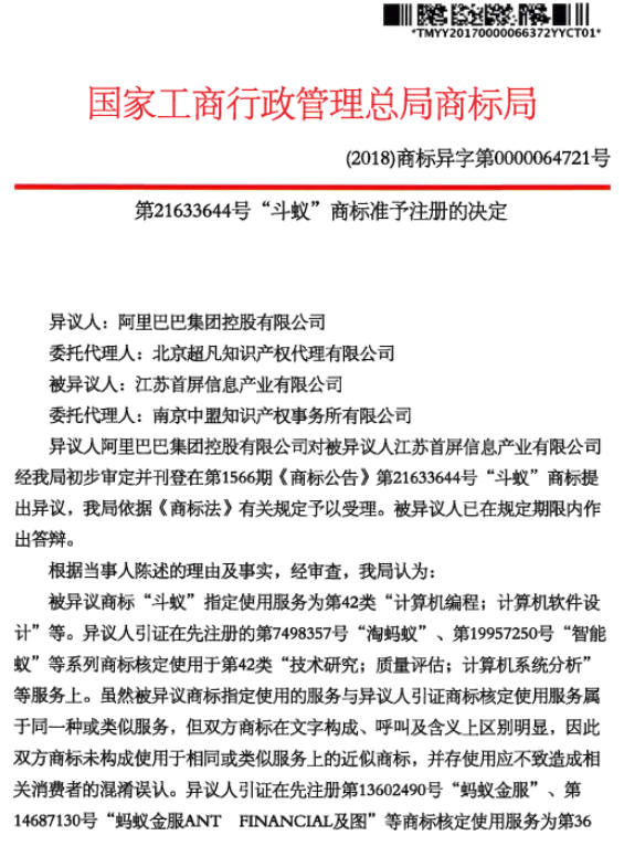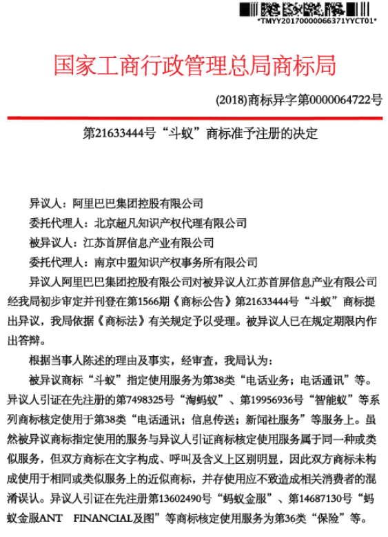 商標(biāo)案例|首屏公司的“斗蟻” 商標(biāo)被阿里巴巴集團(tuán)異議后,結(jié)局如何?