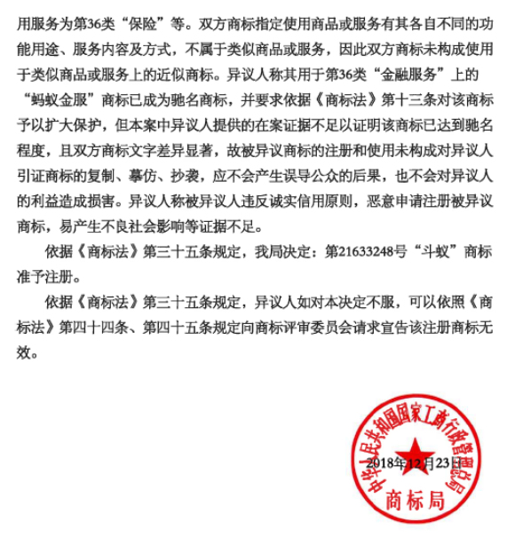 依據(jù)《商標(biāo)法》第三十五條規(guī)定,我局決定:第21633248號(hào)“斗蟻”商標(biāo)準(zhǔn)予注冊(cè)。
