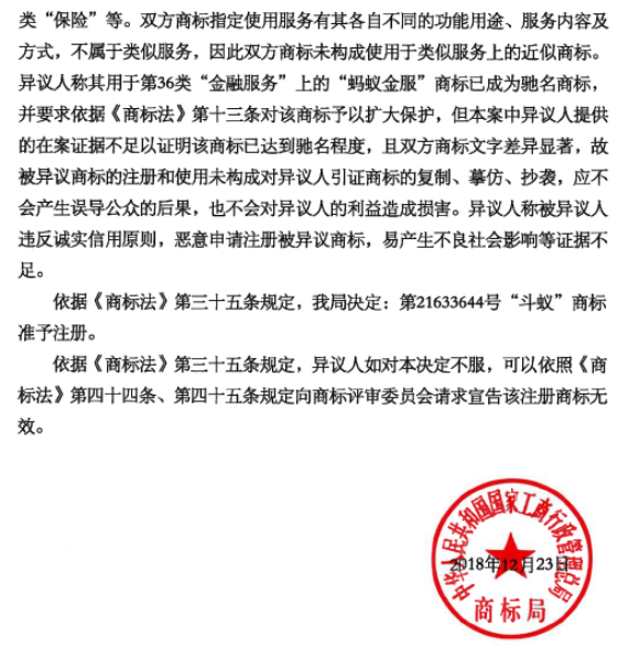 依據(jù)《商標(biāo)法》第三十五條規(guī)定,我局決定:第21633644號(hào)“斗蟻”商標(biāo)準(zhǔn)予注冊(cè)。