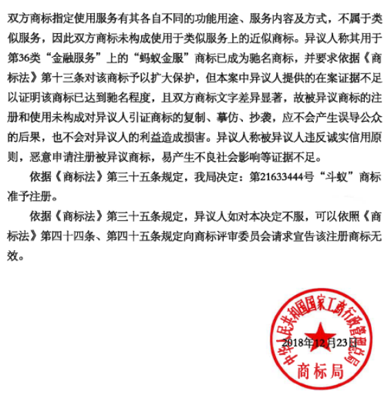 依據(jù)《商標(biāo)法》第三十五條規(guī)定,我局決定:第21633444號(hào)“斗蟻”商標(biāo)準(zhǔn)予注冊(cè)。