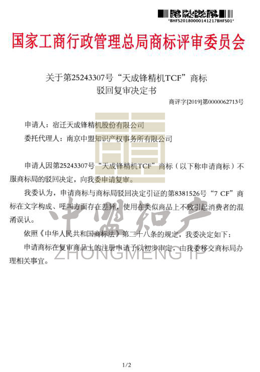 1)第25243307號“天成鋒精機(jī)TCF”商標(biāo)駁回復(fù)審決定書!