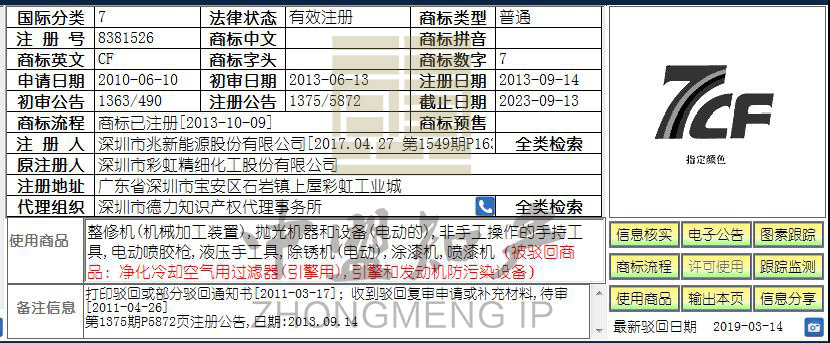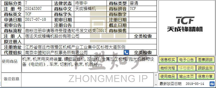 隨著社會對無形資產(chǎn)——商標(biāo)認(rèn)可度的日益提升,宿遷天成鋒精機(jī)為了對自己使用多年的“天成鋒精機(jī)TCF”品牌進(jìn)行保護(hù),也為了避免日后發(fā)生知識產(chǎn)權(quán)侵權(quán)、傍名牌等問題,于2017年7月10日在第7類“機(jī)床、機(jī)床用夾持裝置、螺母攻絲機(jī)、攻絲機(jī)、金屬加工機(jī)械、拋光機(jī)器和設(shè)備(電動的)、車床、切割機(jī)、銑床、機(jī)器臺”商品上申請注冊第25243307號“天成鋒精機(jī)TCF”商標(biāo)。