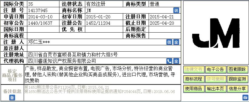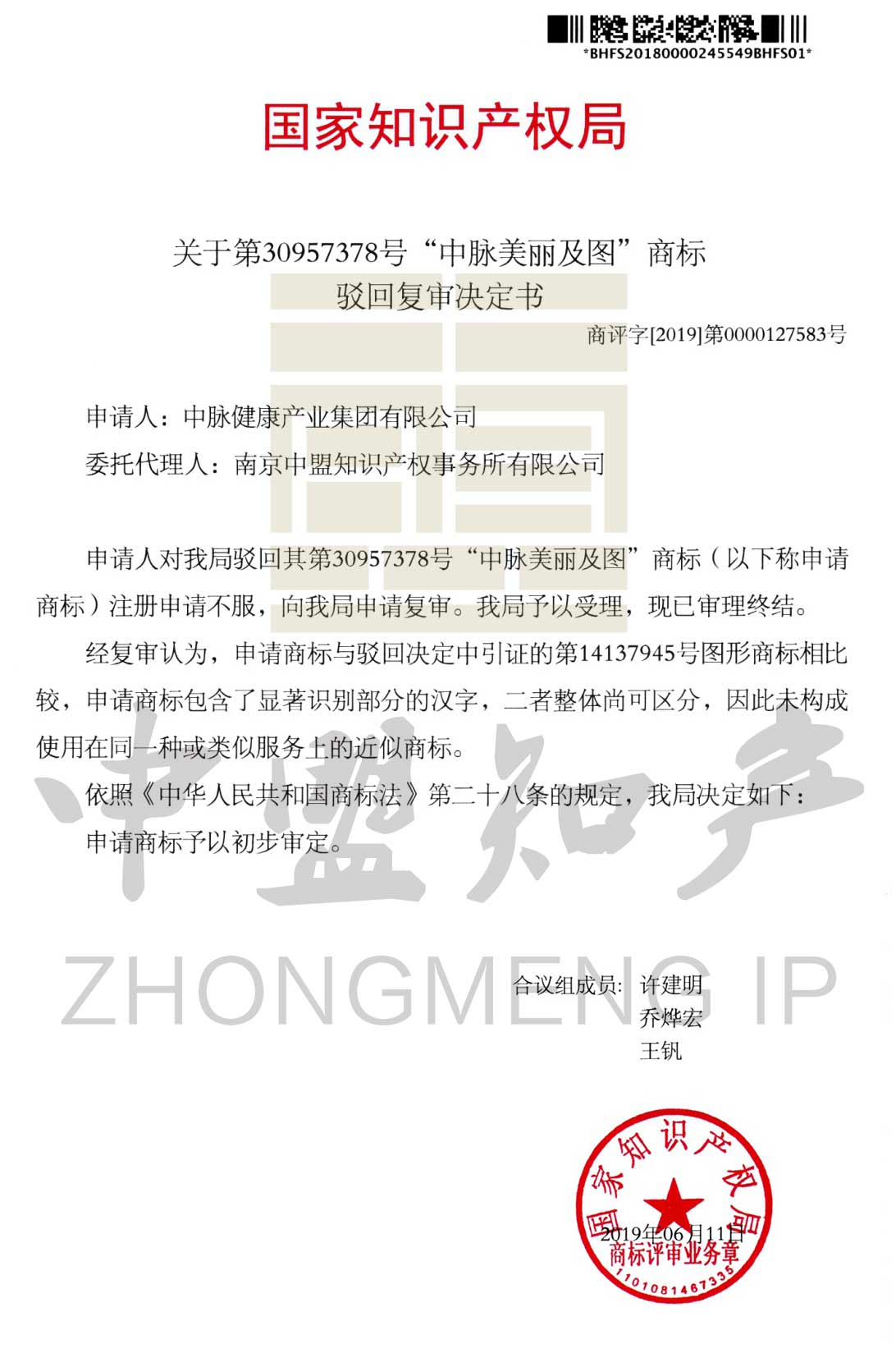 中脈健康產(chǎn)業(yè)集團(tuán)有限公司委托我所申請(qǐng)注冊(cè)第35類“JM中脈美麗”商標(biāo)被商標(biāo)局引證在先的“JM”商標(biāo)而駁回,我所建議中脈健康產(chǎn)業(yè)集團(tuán)有限公司提起駁回復(fù)審程序,進(jìn)一步爭(zhēng)取該商標(biāo)權(quán)利,最終申請(qǐng)人的“JM中脈美麗”商標(biāo)因整體區(qū)分明顯而成功。