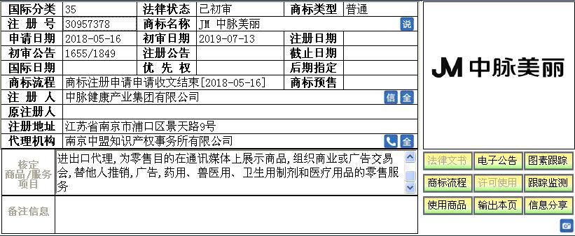 2018年05月16日,中脈健康產(chǎn)業(yè)集團(tuán)有限公司委托我所在第35類“廣告;組織商業(yè)或廣告交易會(huì);進(jìn)出口代理;為零售目的在通訊媒體上展示商品等”具體服務(wù)上申請(qǐng)注冊(cè)“JM中脈美麗”商標(biāo)。
