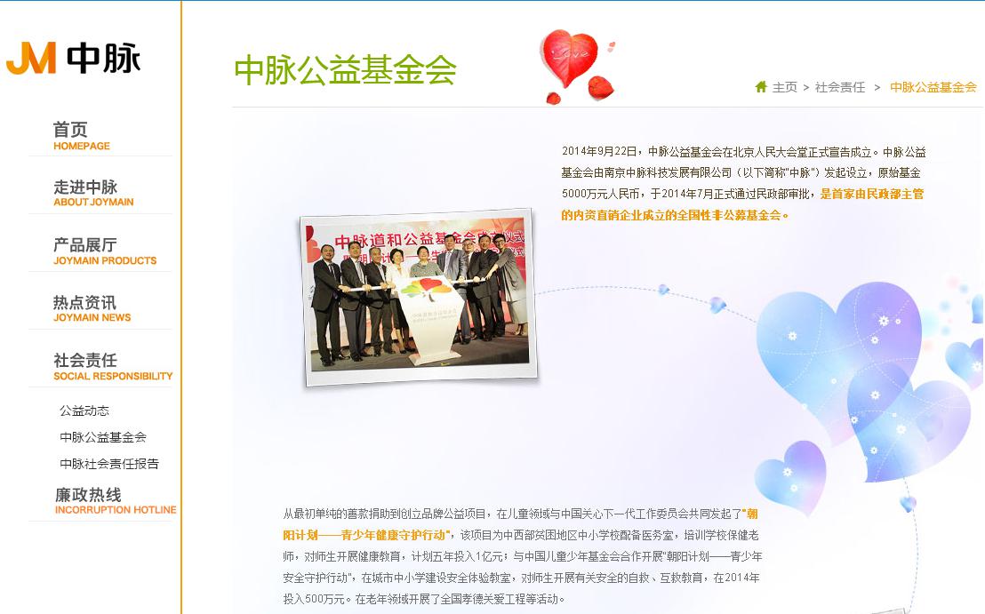 中脈始終倡導(dǎo)誠(chéng)信規(guī)范經(jīng)營(yíng),并以“規(guī)范運(yùn)作、文化培根、系統(tǒng)作戰(zhàn)、美麗前行”作為企業(yè)戰(zhàn)略發(fā)展方針,不斷踐行“共創(chuàng)與共享”核心價(jià)值觀,并積極承擔(dān)著對(duì)社會(huì)、政府、消費(fèi)者、員工等利益相關(guān)方的責(zé)任。中脈參與社會(huì)公益事業(yè),先后開(kāi)展警民心連心溫暖幫扶行動(dòng)、孝德關(guān)愛(ài)工程、朝陽(yáng)計(jì)劃——青少年守護(hù)行動(dòng)等大型社會(huì)公益援助項(xiàng)目。在自身回饋社會(huì)的同時(shí),中脈也倡導(dǎo)所有中脈的供應(yīng)商、經(jīng)銷商、員工和消費(fèi)者,都能為社會(huì)公益貢獻(xiàn)出自己的力量,讓世界因?yàn)槲覀兊牧α孔兊酶用篮谩?br/>