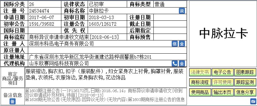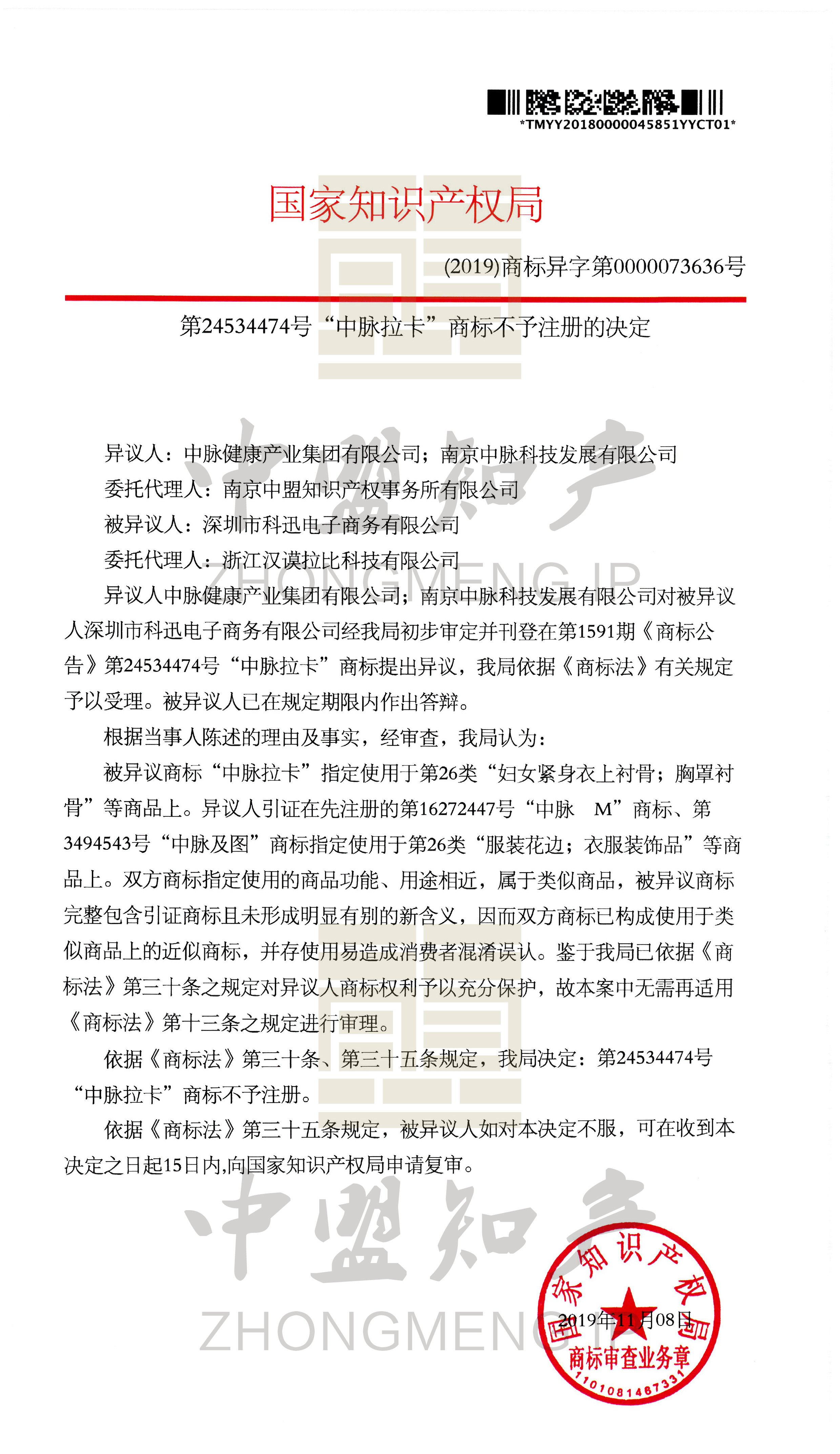 2017年06月07日深圳市科迅電子商務(wù)有限公司在第26類“服裝褶邊,胸衣扣,扣子(服裝配件),婦女緊身衣上襯骨,胸罩襯骨,服裝墊肩,衣領(lǐng)托,衣服飾邊,緊身胸衣鉤,花邊飾品”商品上申請注冊了第24534474號“中脈拉卡”商標(biāo),該商標(biāo)于2018年03月13日通過商標(biāo)局審核,并被予以初步審定公告。我所通過監(jiān)測系統(tǒng),發(fā)現(xiàn)了該商標(biāo)的初審公告信息,向中脈健康產(chǎn)業(yè)集團(tuán)有限公司出具了書面的異議建議方案。2018年8月21日,中脈健康產(chǎn)業(yè)集團(tuán)有限公司委托了我所辦理該商標(biāo)的異議申請程序。