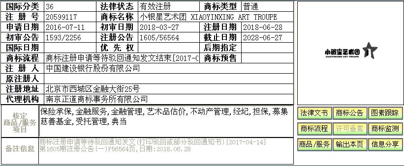 2016年07月11日中國建設(shè)銀行股份有限公司在第36類“保險承保,金融服務(wù),金融管理,藝術(shù)品估價,不動產(chǎn)管理,經(jīng)紀(jì),擔(dān)保,募集慈善基金,受托管理,典當(dāng)”服務(wù)上申請注冊第20599117號“小銀星藝術(shù)團(tuán)”商標(biāo)。2018年06月28日商標(biāo)局將該商標(biāo)予以核準(zhǔn)注冊。